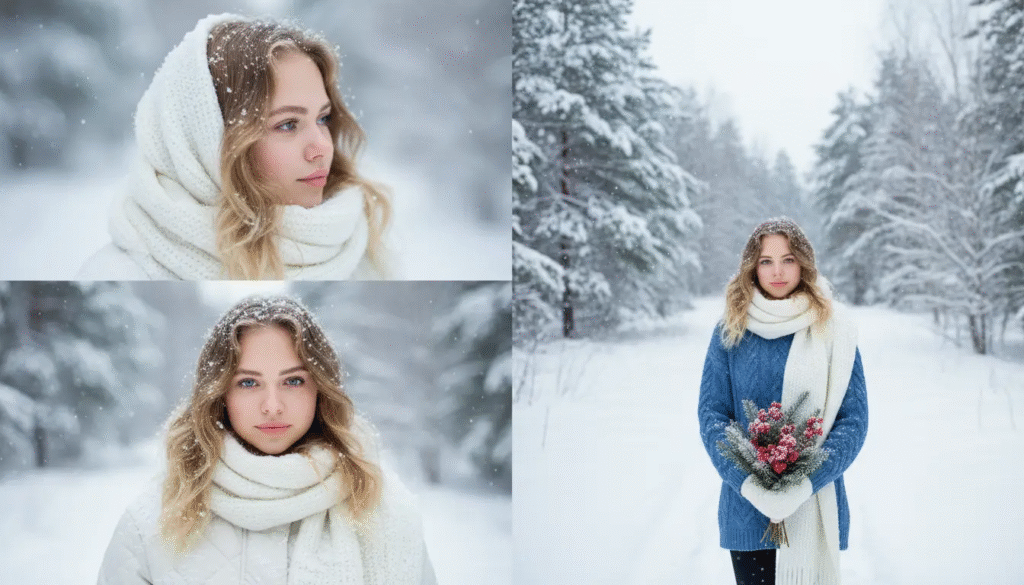 - Retrato Aconchegante de Inverno: “Um retrato aconchegante de inverno de uma mulher com um suéter creme, com flocos de neve caindo, uma suave luz dourada e um fundo nevado desfocado.”