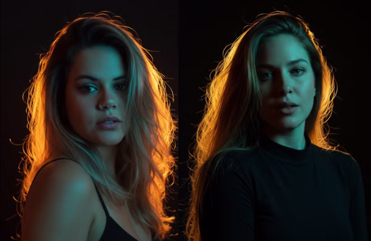 Iluminação: contraluz quente (amarelo/laranja) e luz fria (azul/verde) para contraste cinematográfico.